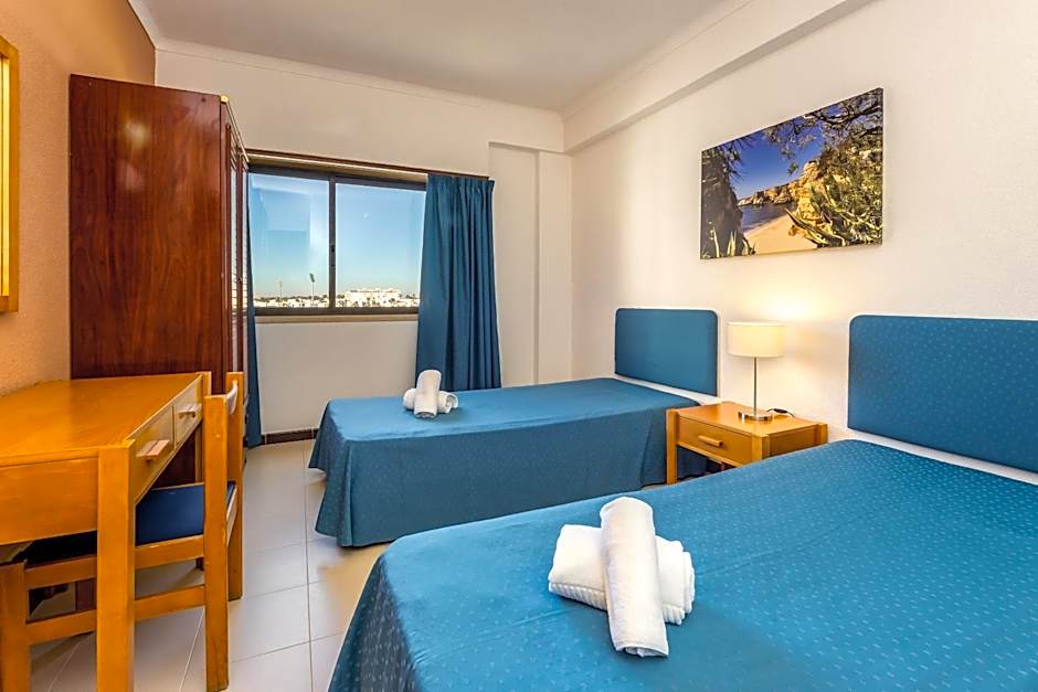Each is decorated with wooden furniture and blue fabrics and have a private bathroom.
